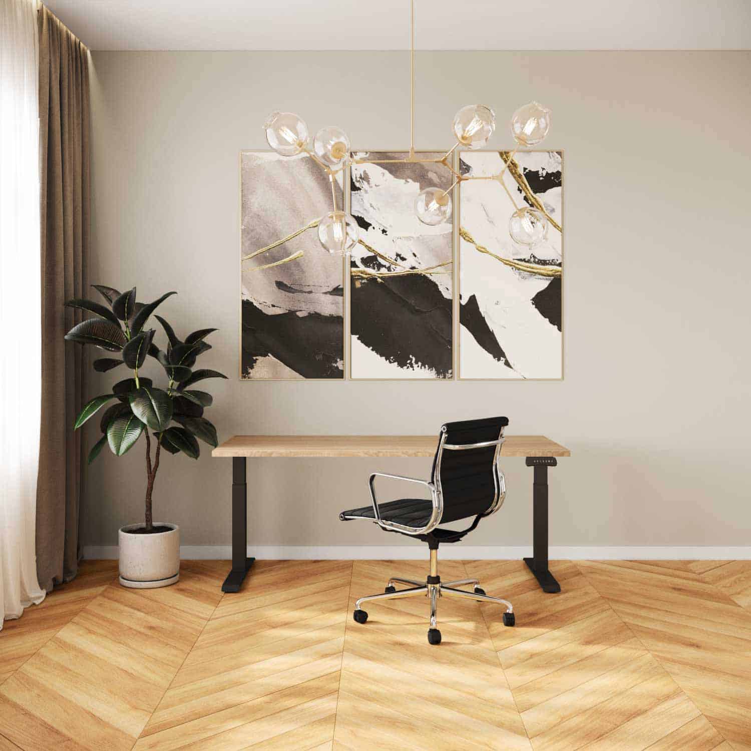 Dit bureau is voorzien van 68 cm lange voeten, waardoor een bureaubladdiepte van 70 tot 85 cm wordt aanbevolen. Onze Bardolino Eiken bureaubladen, vervaardigd in onze fabriek in Nederland, kunnen naar wens uitgerust worden met CNC-geboorde gaten voor de integratie van powerdocks en kabelbeheer. Dankzij het verstelbare frame, dat reikt van 120 tot 190 cm, is het mogelijk om bureaubladen van 120 cm tot een maximale breedte van 210 cm te monteren.