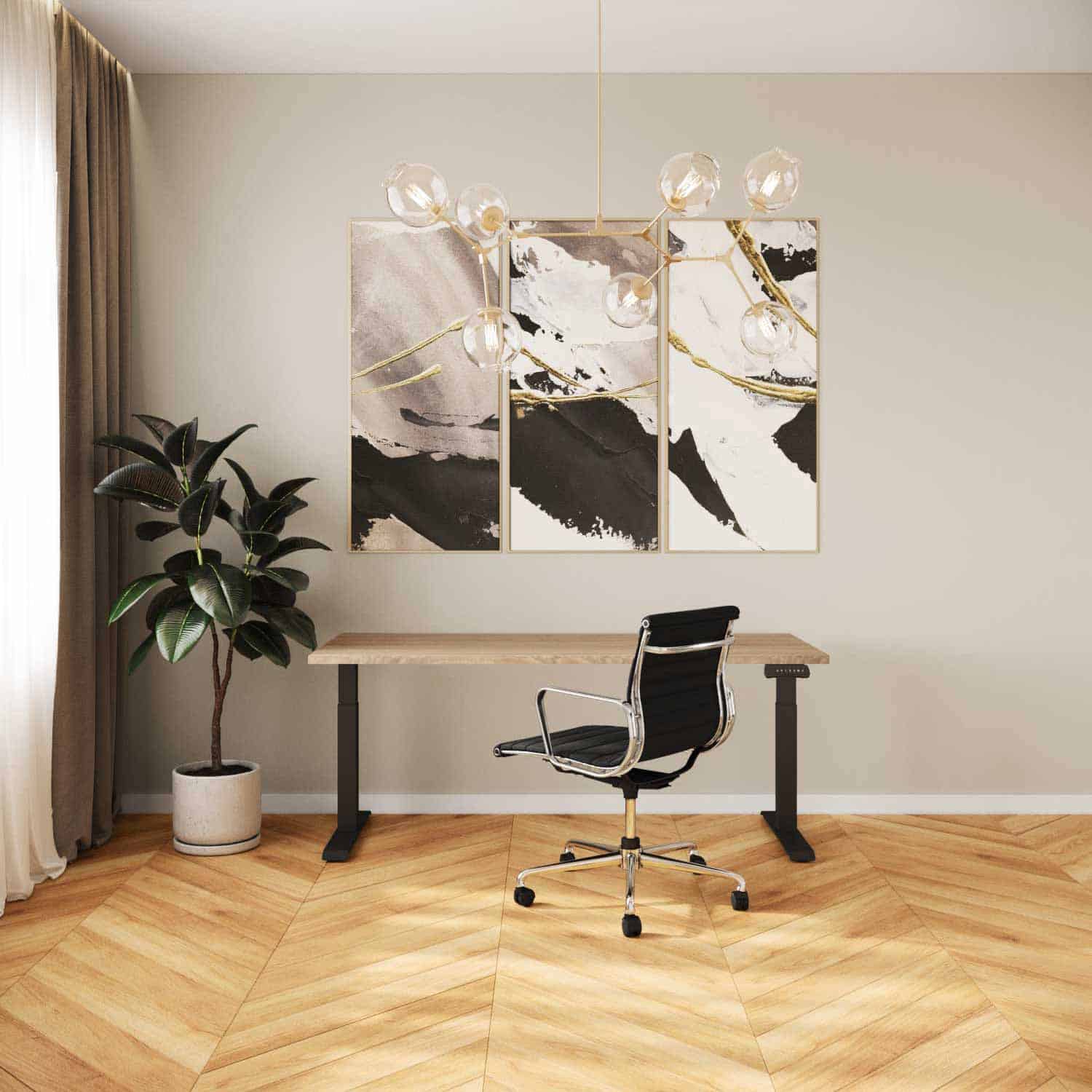 Dit bureau is voorzien van 68 cm lange voeten, waardoor een bureaubladdiepte van 70 tot 85 cm wordt aanbevolen. Onze Bardolino Grijs Eiken bureaubladen, vervaardigd in onze fabriek in Nederland, kunnen naar wens uitgerust worden met CNC-geboorde gaten voor de integratie van powerdocks en kabelbeheer. Dankzij het verstelbare frame, dat reikt van 120 tot 190 cm, is het mogelijk om bureaubladen van 120 cm tot een maximale breedte van 210 cm te monteren.