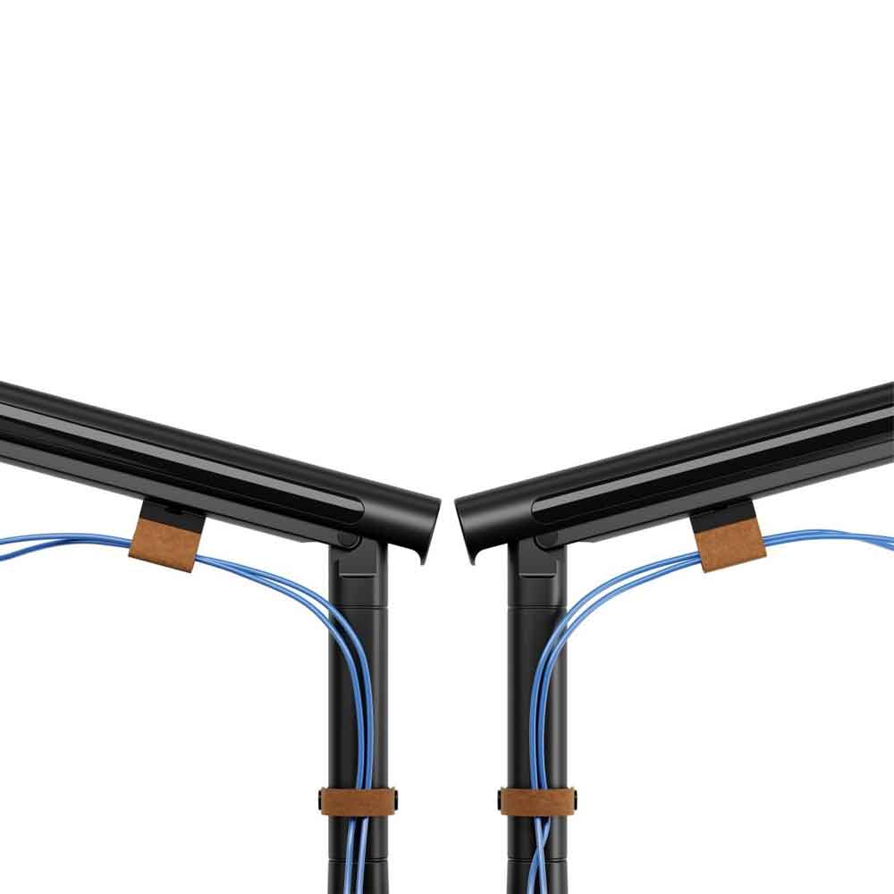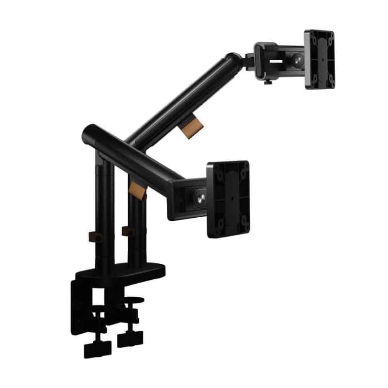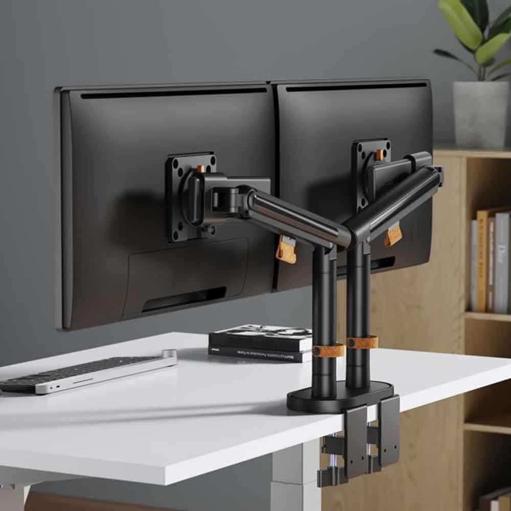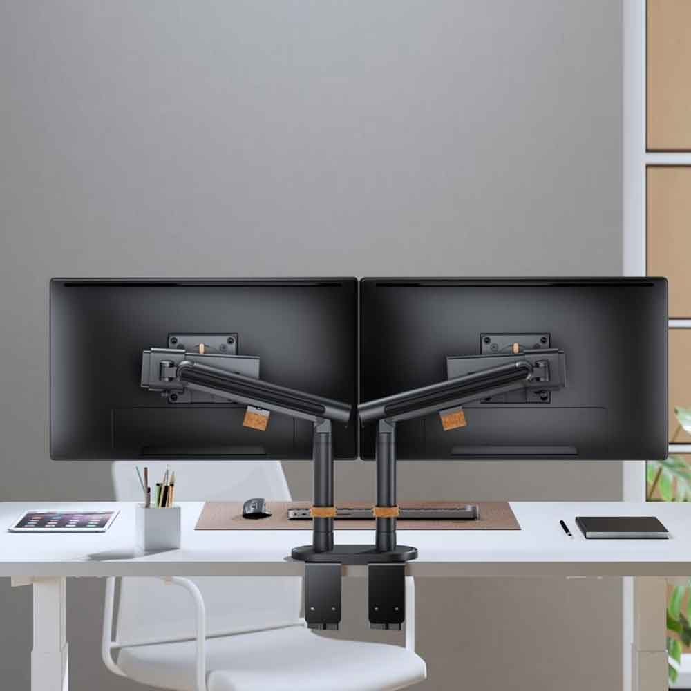 Til je werkplek naar het volgende niveau met deze dubbele uitvoering van de luxe zwarte monitorarm. Speciaal ontworpen voor wie met twee schermen werkt en waarde hecht aan zowel functionaliteit als design. De robuuste armen zijn afzonderlijk verstelbaar, waardoor je beide monitoren precies zo kunt positioneren als jij prettig vindt – of je nu multitaskt, ontwerpt of presenteert.