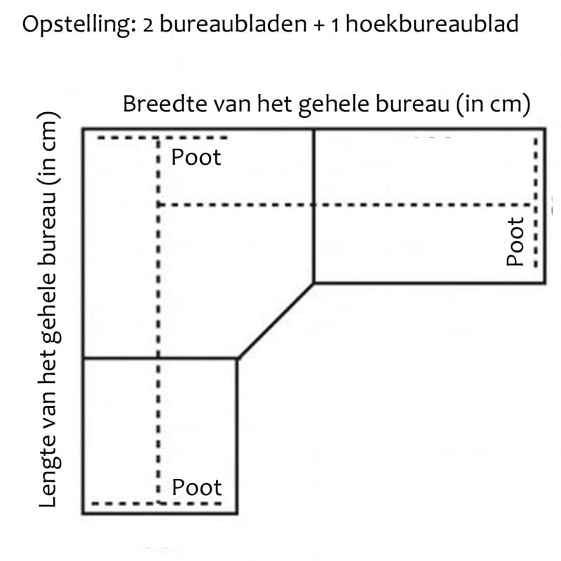 - Een hoekbureau op maat met 2 standaard bureaubladen en een hoekbureaublad.