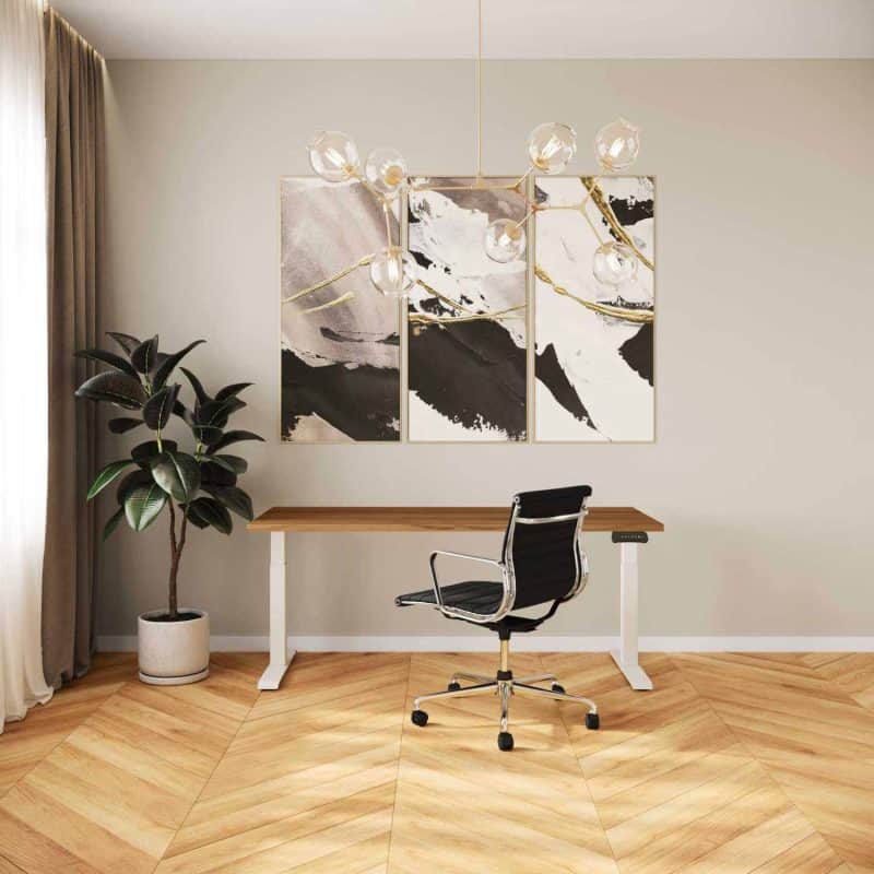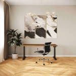 Dit bureau is voorzien van 68 cm lange voeten, waardoor een bureaubladdiepte van 70 tot 85 cm wordt aanbevolen. Onze Notenhout Dijon bureaubladen, vervaardigd in onze fabriek in Nederland, kunnen naar wens uitgerust worden met CNC-geboorde gaten voor de integratie van powerdocks en kabelbeheer. Dankzij het verstelbare frame, dat reikt van 120 tot 190 cm, is het mogelijk om bureaubladen van 120 cm tot een maximale breedte van 210 cm te monteren.