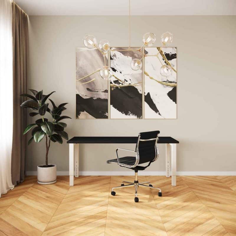 Het op maat gemaakte Zwart Eiken bureau (U998 ST38) van Elswout met N poot heeft een hoogwaardige bureaublad van 18mm of 28 mm dik. Het bureaublad wordt ondersteund door een buitengewoon stabiel 4-poots bureauonderstel dat voldoet aan alle arbo-eisen. Het bureau is in hoogte verstelbaar (62-86 cm) met behulp van een inbussleutel, zodat het voor iedereen mogelijk is om comfortabel achter het bureau te zitten en te werken. Wilt u afwisselend zittend en staand werken? Bekijk dan onze collectie Zit Sta bureaus.